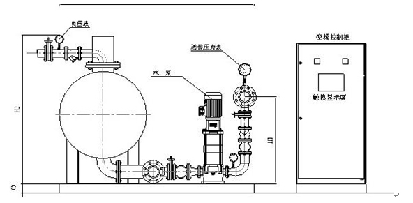 RWG系統(tǒng)智能型無負(fù)壓變頻供水設(shè)備是由穩(wěn)流調(diào)節(jié)器、負(fù)壓抑制器、水泵機(jī)組、智能變頻控制柜、遠(yuǎn)傳壓力表、各種閥門管件等組成。其原理圖如下所示。